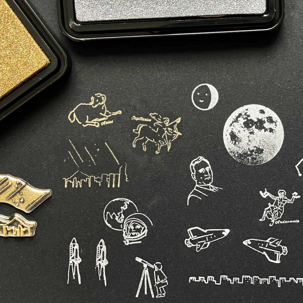 宇宙をテーマにしたクリアスタンプ(月、星座、ロケットなど)を使った楽しいワークショップを開催いたします。